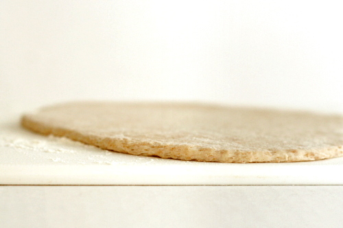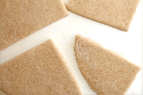 4. On a lightly floured surface, roll out the dough, in portions if necessary, until it’s just under 1/8-inch thick.  Using a pizza cutter, cut the dough into squares or rectangles of whatever size you want – a few inches per side is standard.