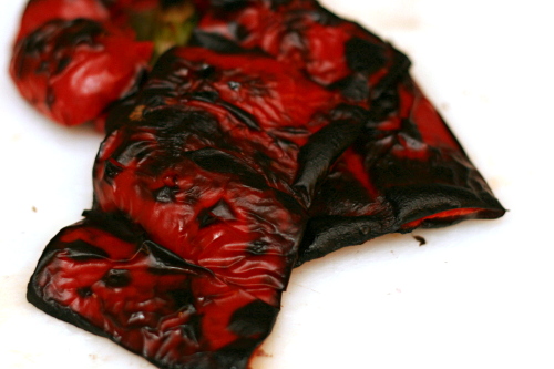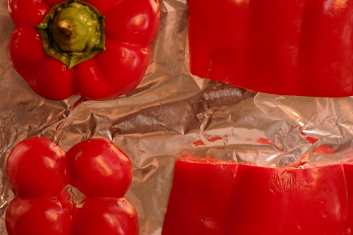1. Adjust a rack to the upper-middle position and heat the broiler. Line a baking sheet with foil. Cut a ½-inch slice from the top and bottom of the red peppers. Remove the seeds; cut the middle section of the pepper in half from top to bottom; cut out the veins. Place the pepper skin-side up on the prepared baking sheet and broil until the skin is blistered and black, about 15 minutes. Remove the peppers from the oven and place them in a medium bowl. Cover the bowl and let the peppers steam for at least 10 minutes to loosen the skin. Leave the broiler on.