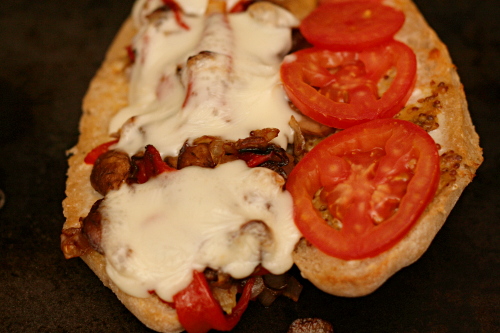 So mushrooms were in, of course, as well as caramelized shallots and roasted red peppers. I added the out-of-season mealy tomatoes simply because it seems traditional on a toasted sub, but I think chopped sun-dried tomatoes mixed with the other vegetables would be more flavorful.