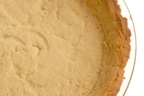 3. Spray a 9-inch tart pan (or a pie pan, but then your crust will be thicker, like mine) with nonstick spray. Lightly pat the dough onto the bottom of the pan and up the sides. Freeze the lined pan for at least an hour before baking.