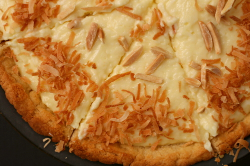 5. Assembly: Remove the chilled pastry cream from the freezer and stir in the unsweetened coconut. Spread the pastry cream into the cooled crust; smooth the top. Place a piece of plastic wrap directly over the filling and refrigerate for at least 3 hours. During this time, the coconut will soak up moisture from the filling, become softer and thickening the filling further.