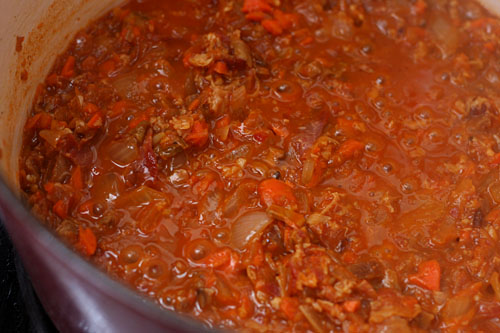 To get the intensity I was hoping for, I pulled out every umami trick I know. Beef, obviously, and all the tomatoes don’t hurt. Dried porcini mushrooms, tomato paste (added with the aromatics and browned slightly), and pancetta added layers of meaty flavor.